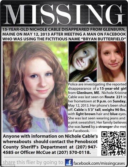 Thông báo mất tích Nichole Cable có nêu người cô bé gặp sử dụng nickname "Bryan Butterfild" trên facebook