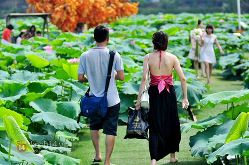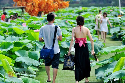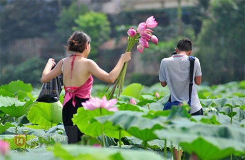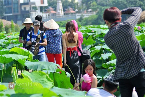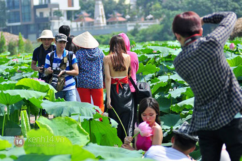 Vào những ngày cuối tuần, lượng người đổ về các đầm sen ở Tây Hồ càng trở nên đông đúc, nhất là vào đầu giờ sáng và cuối giờ chiều hàng ngày. Tuy nhiên, vì nhiều lý do, có người lại chụp ảnh vào lúc giữa trưa nắng nóng gay gắt. |