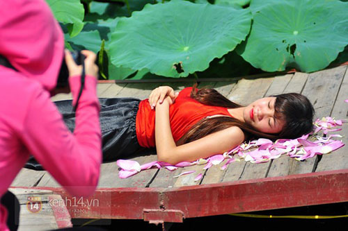Sẵn sàng nằm dưới sàn gỗ ở ao sen để có bức ảnh đẹp. |