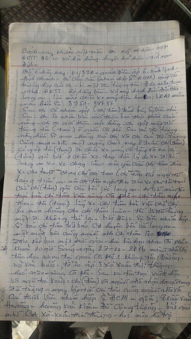 Theo đơn trình báo của nạn nhân Nguyễn Thị Tâm (SN 1971, ngụ huyện Bình Chánh, TP HCM) với nhóm hiệp sĩ: Chị là nhân viên bán thực phẩm chức năng. Công việc hàng ngày là đi khắp các vùng, quán cafe để giới thiệu sản phẩm, tìm khách hàng.