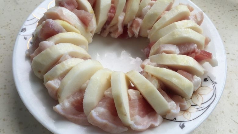 Bước 4: Xếp xen kẽ một lát thịt với 1 miếng khoai sọ ở trong đĩa.