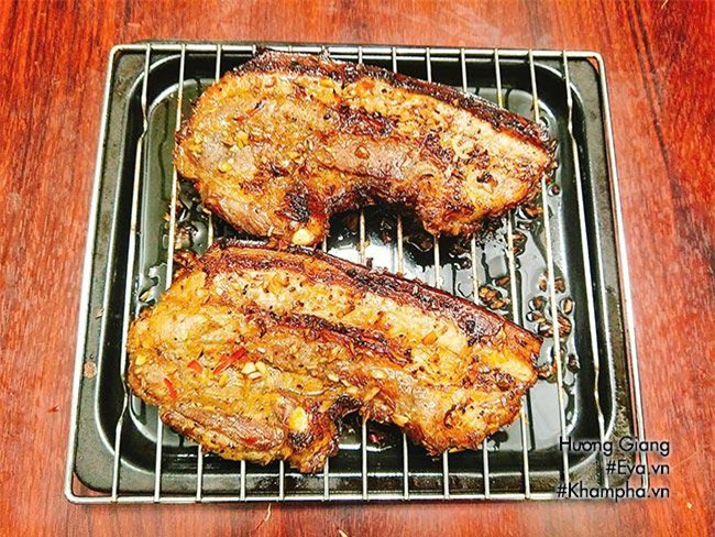 Bước 5: Bật lò nướng 220 độ C làm nóng lò nướng hoặc bạn cũng có thể nướng bằng than hoa. Xếp thịt ba chỉ lên giá sắt, phía dưới dùng khay nướng để hứng nước mỡ chảy ra trong quá trình nướng.