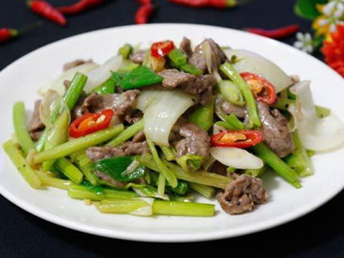 Tiếp theo cho thịt bò và tất cả phần gia vị còn lại vào đảo đều. Xào thịt bò 2 phút trên lửa to thì cho hành thái khúc dài 3cm vào đảo thêm 30 giây thì tắt bếp.