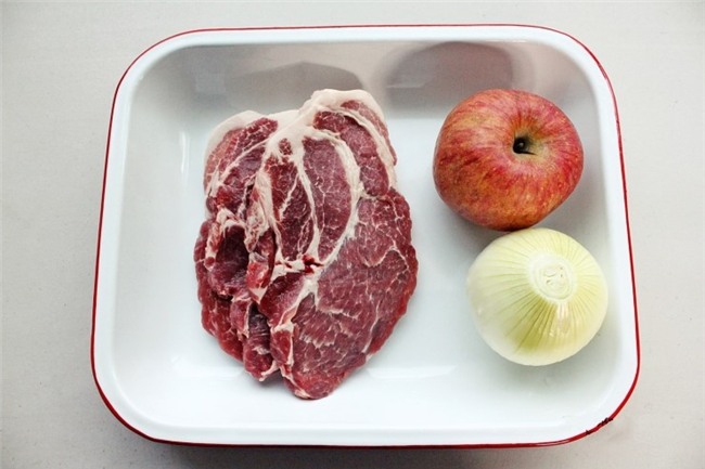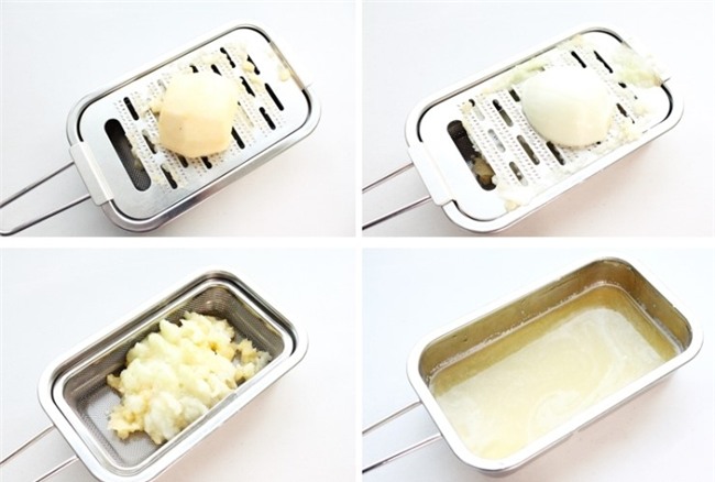 Hành tây bóc bỏ vỏ, táo gọt vỏ. Bào nhỏ hành tây và táo, hòa với một ít nước rồi vắt lấy 200ml nước cốt.