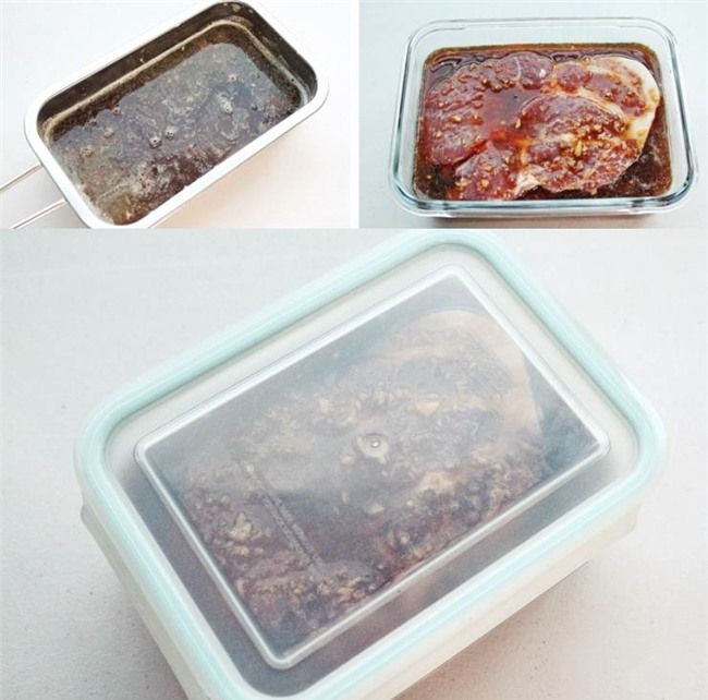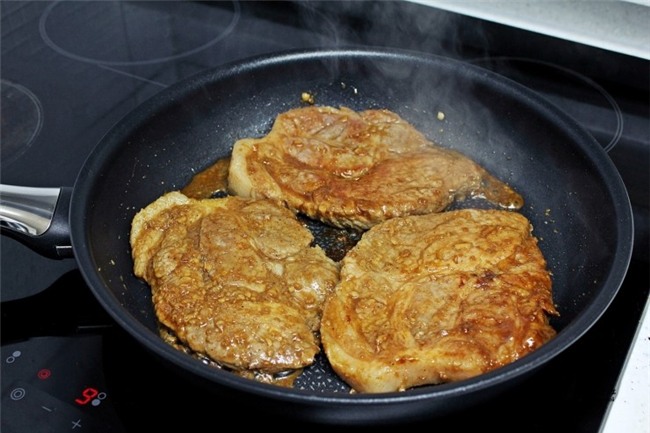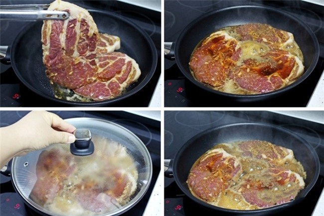 Lấy thịt ra chiên thịt trên chảo chống dính ở lửa vừa, thêm nước ướp thịt vào. Bạn đậy nắp cho thịt chín.