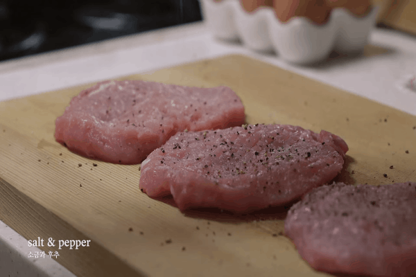 Thịt cốt lết mua về rửa sạch, để ráo nước sau đó rắc chút muối và hạt tiêu lên khắp miếng thịt. Để chừng 15 phút cho ngấm.