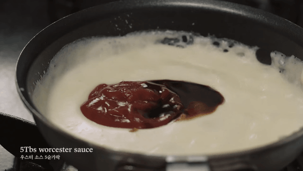Sau đó cho sữa, nước vào khuấy đều. Tiếp tục thêm đường, ketchup và nước sốt worcester vào.
