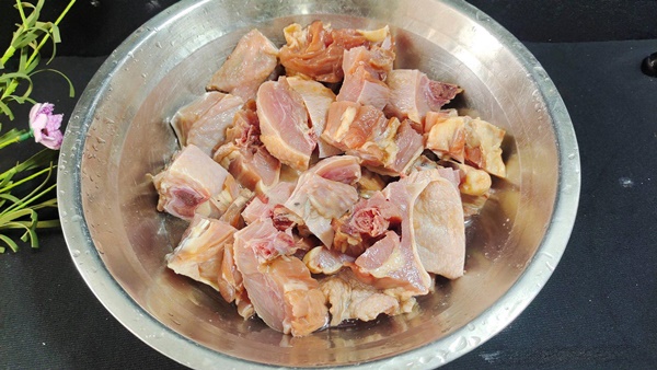 Bước 2: Dùng muối và một ít gừng thái lát, chà xát lên toàn bộ phần đùi gà để loại bỏ chất bẩn và tạp chất. Sau đó rửa sạch đùi gà dưới vòi nước. Chặt chân gà thành các miếng có kích thước vừa ăn rồi ngâm trong nước ấm khoảng 30 phút cho sạch phần tiết dư thừa. Sau đó rửa sạch lại rồi vớt ra để ráo nước.