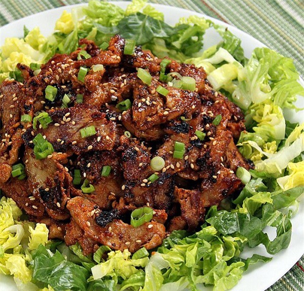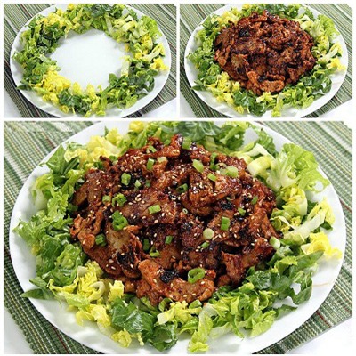![]() | ![]() Thái nhỏ các loại rau, sau đó, đặt thịt lên. Trang trí thêm với hành lá thái nhỏ và vừng. Hoặc quấn thịt trong lá rau diếp để làm thành món cuốn. |