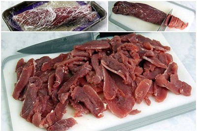 ![]() | ![]() Để thái mỏng thịt, gói thịt vào giấy bọc thực phẩm, đặt lên khay rồi cho vào ngăn đông tủ lạnh khoảng 60-90 phút. Thịt sẽ chắc lại nhưng không đông hoàn toàn, dễ hơn cho việc thái mỏng. |