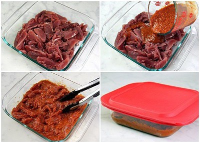 ![]() | ![]() Trải đều thịt ra khay rồi đổ phần sốt ướp lên, lăn đều cho thịt ngấm, bọc lại và cho vào tủ lạnh ít nhất 2 tiếng, ngon hơn nếu để qua đêm. |
