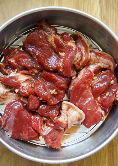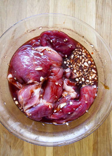 Thịt heo rửa sạch, cho vào tô. Hòa tất cả phần nguyên liệu ướp thịt với nhau sao đó đổ vào tô thịt, rồi trộn đều. Dùng màng bọc thực phẩm phin kín lại đặt vào tủ lạnh để qua đêm.