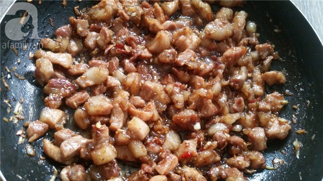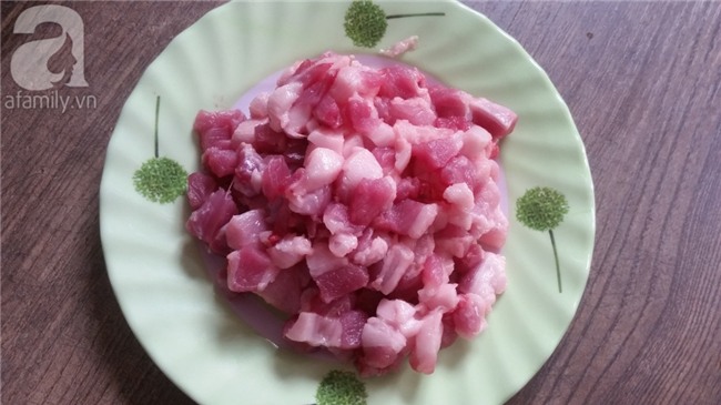 Thịt ba chỉ rửa sạch, để ráo nước, sau đó cắt thành từng miếng nhỏ.