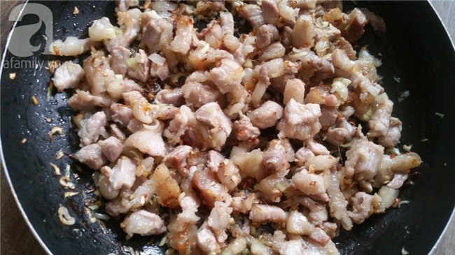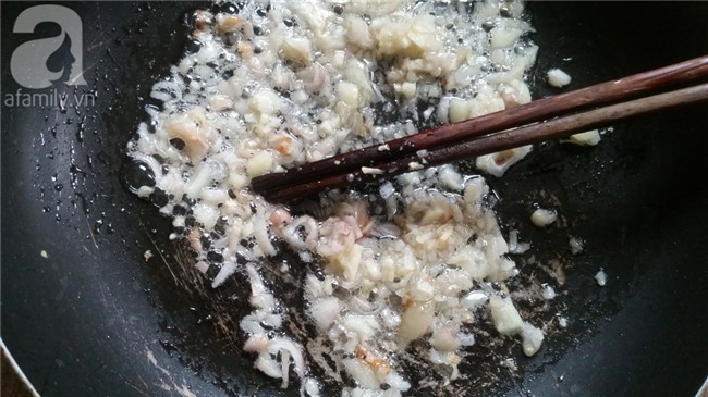Mắm ruốc pha với chút nước, hòa tan rồi để lắng. Phi thơm hành tỏi với chút dầu ăn.