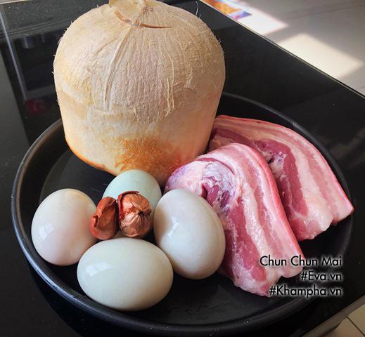 Bắc nồi lên bếp, cho thịt vào đảo sơ, sau đó cho nước dừa vào nồi, sao cho nước ngập mặt thịt rồi đun lửa to. Nước sôi hớt hết bọt cho nước trong. Sau đó kho nhỏ cho đến khi thịt chín mềm. Khi thịt gần được cho trứng vào kho tiếp khoảng 15 phút, nêm 1 thìa nước mắm cho thơm là được.