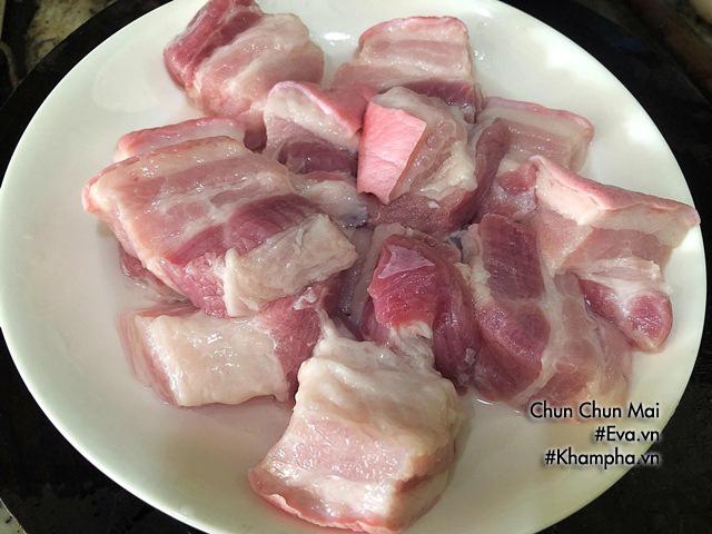 - Thịt thái miếng cỡ 4-5 cm. Đối với món thịt này bạn phải thái miếng lớn, to gấp 3-4 lần so với thịt kho bình thường. Sau khi thái bóp với 1 thìa muối hạt và rửa lại thật sạch.