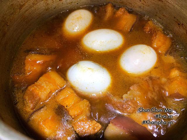 Chú ý nước dừa phải cao hơn mặt thịt, nếu nước cạn thì bổ sung thêm nước để kho và món thịt kho này không kho cạn mà vẫn còn chút nước.