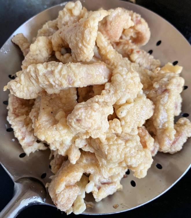 Đun nóng nhiều dầu ăn trong chảo sâu lòng. Sau đó thả thịt lợn vào chiên đến khi thịt nổi lên thì vớt ra để ráo.