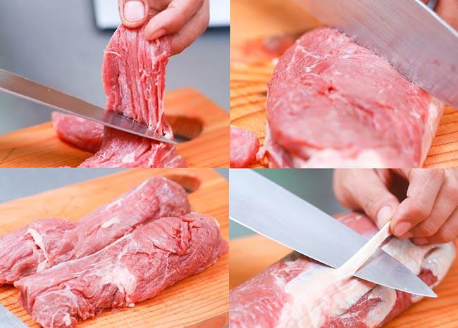 Dùng dao lọc bỏ hết phần gân trắng, khứa nhẹ hình chéo trên miếng thịt. Không nên để nguyên một miếng thịt to như vậy khi chế biến, nên cắt làm đôi. Thịt thăn mua về nên chế biến ăn ngay, nếu mua nhiều có thế cất vào ăn đông để lần sau dùng.