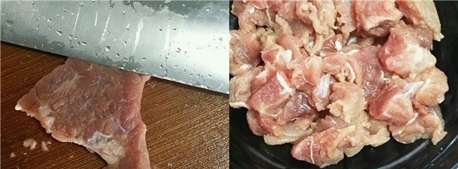 Thịt rửa sạch cắt lát dày 1cm, dùng gáy dao dần cho miếng thịt mềm mỏng sau đó cắt lát thịt thành từng miếng nhỏ.