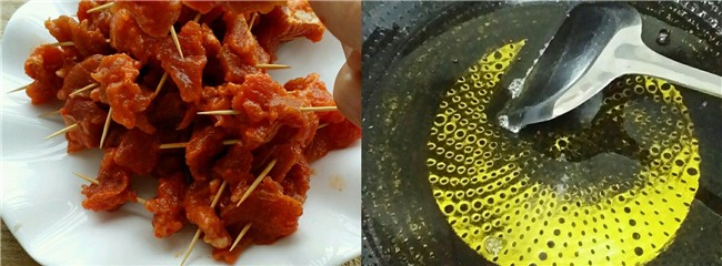 Cuốn từng miếng thịt rồi xiên qua tăm nhọn sau đó thì đun nóng dầu ăn trong chảo.