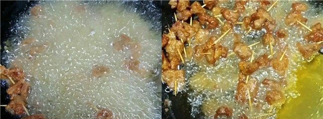 Cho thịt đã xiên vào chảo dầu nóng chiên cho đến khi thịt chín vàng thì vớt ra đĩa. Rắc chút hành lá thái nhỏ và vừng rang chín lên trên là xong.