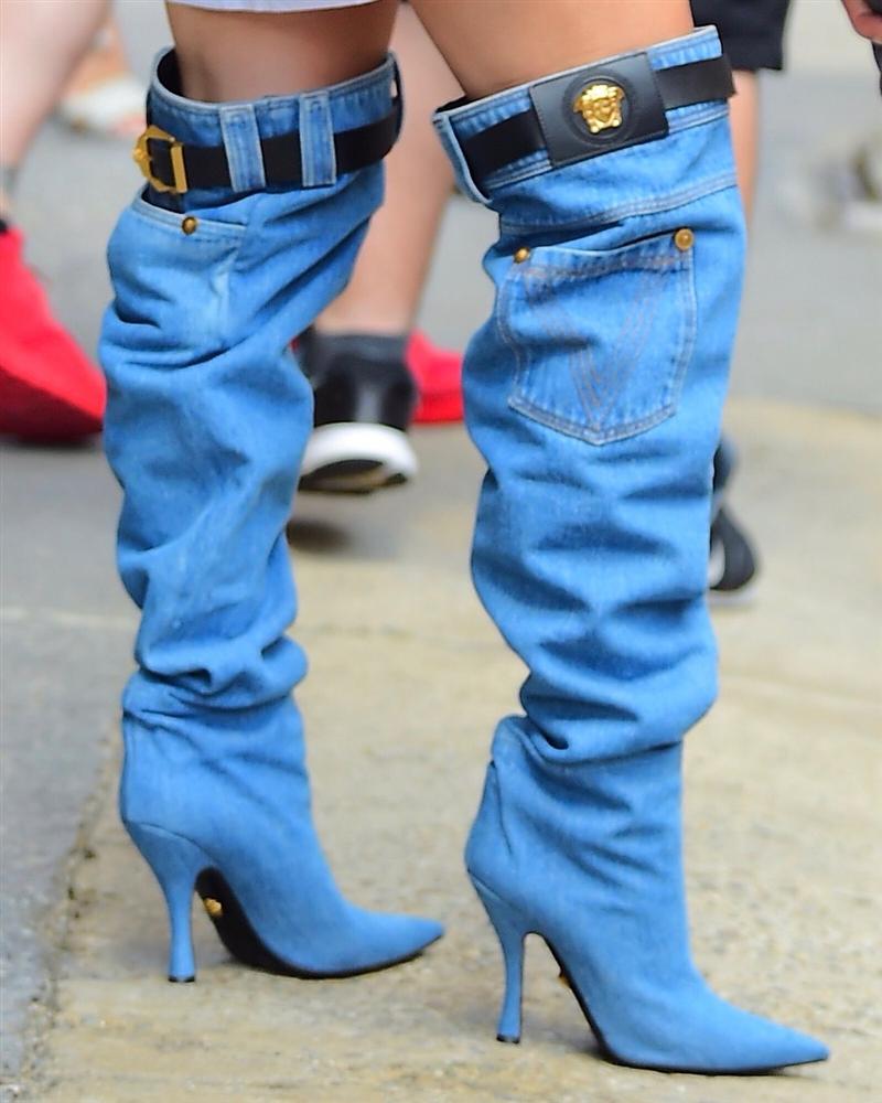 Đôi boot này được thiết kế hệt như một chiếc quần jeans, từ chất liệu vải denim màu xanh đặc trưng cho đến đỉa quần kèm thắt lưng. Qua logo nữ quỷ đầu rắn màu vàng kim nổi bật, không khó để nhận ra đây là một thiết kế của nhà mốt Ý Versace.
