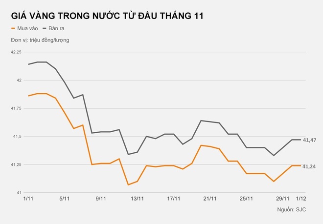 Tháng 11 là thời điểm giá vàng trong nước rơi xuống vùng giá thấp nhất sau khi tăng vượt ngưỡng 42 triệu đồng/lượng từ tháng 8. Cũng trong tháng vừa qua, giá vàng chủ yếu giao dịch ở vùng 41,5 triệu đồng/lượng với biên độ dao động dưới 150.000 đồng/lượng, mức biến động tháng thấp nhất kể từ tháng 8 đến nay.Giảm gần 700.000 đồng/lượng tháng 11