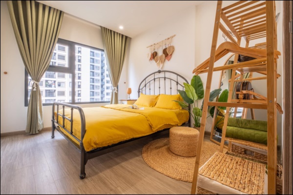 Để không chiếm nhiều diện tích của phòng ngủ, chủ nhân không dùng tủ gỗ mà chọn các giá gỗ thoáng để treo, đựng quần áo.