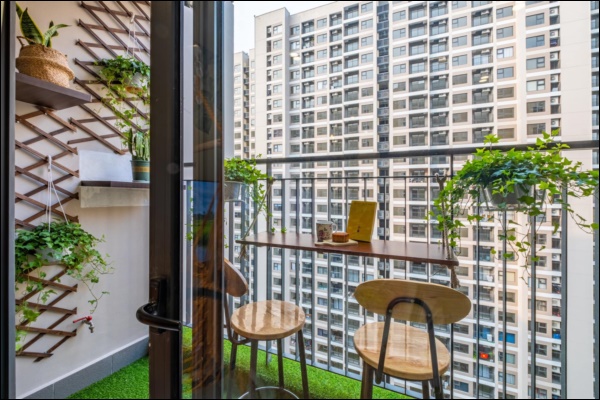 Ban công được chủ nhân trang trí thêm cây xanh, ghế, kệ uống nước để ngồi thư giãn hay đọc sách.