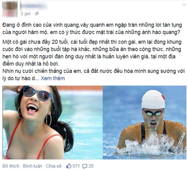 N.M ghép ảnh cá nhân của mình xinh đẹp, rạng rỡ bên hồ bơi và ảnh Ánh Viên đang tập luyện cực nhọc làm minh họa cho status bày tỏ thương xót cho tuổi trẻ của kình ngư tuổi 19.