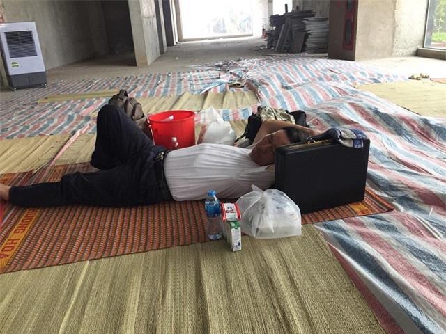 Ngay trước sảnh, nhiều phần thức ăn, nước uống... cùng những vật dụng thiết yếu cũng được chuẩn bị sẵn sàng phục vụ cư dân chung cư Carina. Phía bên trong, sảnh nền xi măng được lót bạt, chiếu cùng nhiều quạt máy công suất lớn để đảm bảo cho người dân được thoải mái khi sinh hoạt “nhờ”.