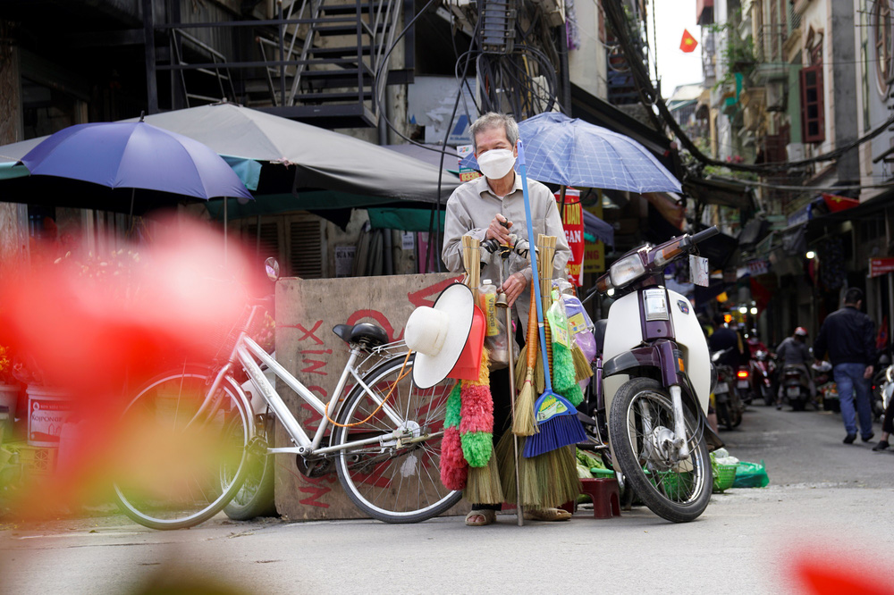 Ông cụ 71 tuổi cho biết trước đây mắt ông còn nhìn thấy mờ mờ, ông đẩy xe đi bán khắp khu Hoàn Kiếm, Ba Đình, chổi chít của ông có thương hiệu, nhiều người mua thích.