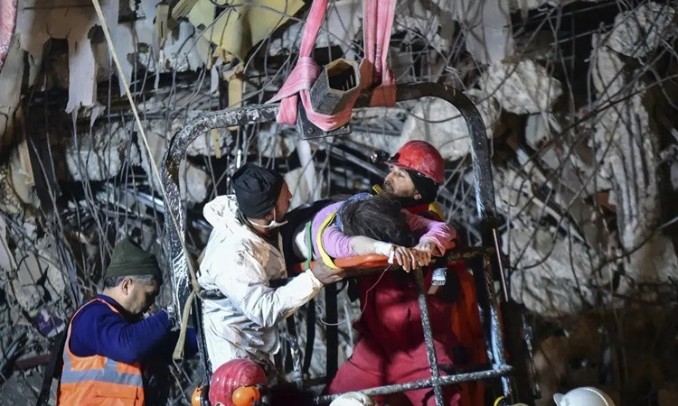 Lực lượng cứu hộ giải cứu người phụ nữ mắc kẹt ở Kahramanmaras, Thổ Nhĩ Kỳ, hôm 9/2. Ảnh: AP