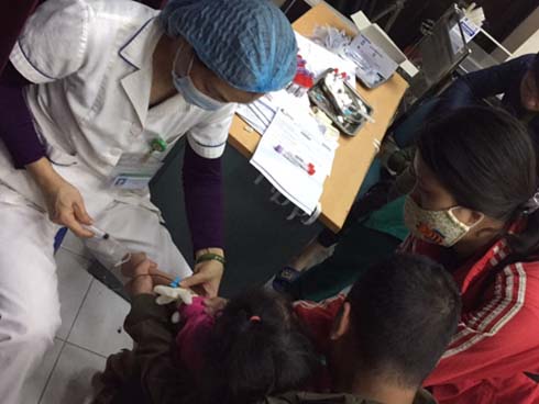 Các bệnh viện phải làm từ 5h trong tình trạng quá tải sau khi phụ huynh đưa trẻ đi xét nghiệm. Ảnh: N.H.