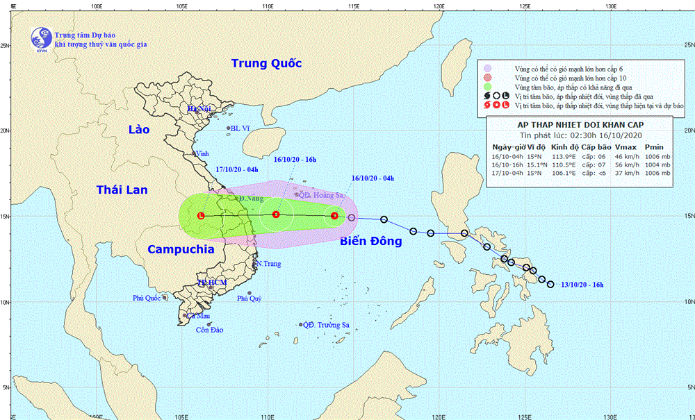 Theo thông tin từ TTKTTVQG, vào hồi 04 giờ ngày 16/10, vị trí tâm áp thấp nhiệt đới cách bờ biển các tỉnh Đà Nẵng - Khánh Hòa khoảng 510km về phía Đông. Sức gió mạnh nhất vùng gần tâm áp thấp nhiệt đới mạnh cấp 6 (40-50km/giờ), giật cấp 8.