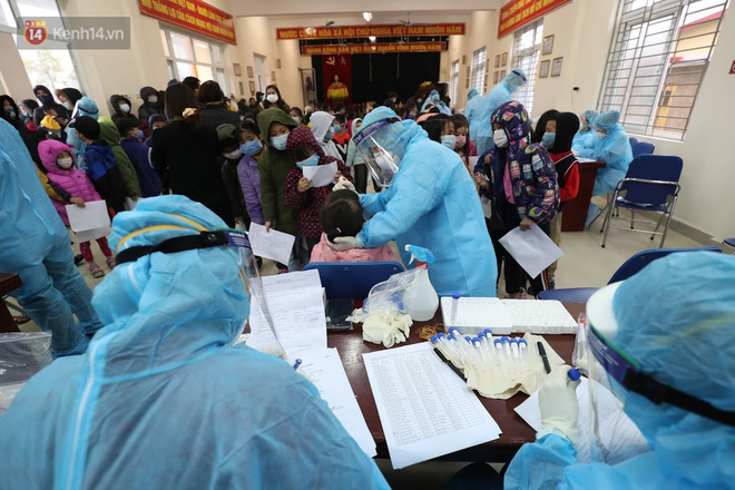 Đến 2h chiều ngày 31/1, các công tác chuẩn bị để lấy mẫu xét nghiệm đã hoàn tất, cơ quan chức năng sắp xếp các cháu theo hàng giữ khoảng cách đi vào hội trường để tiến hành lấy mẫu xét nghiệm.