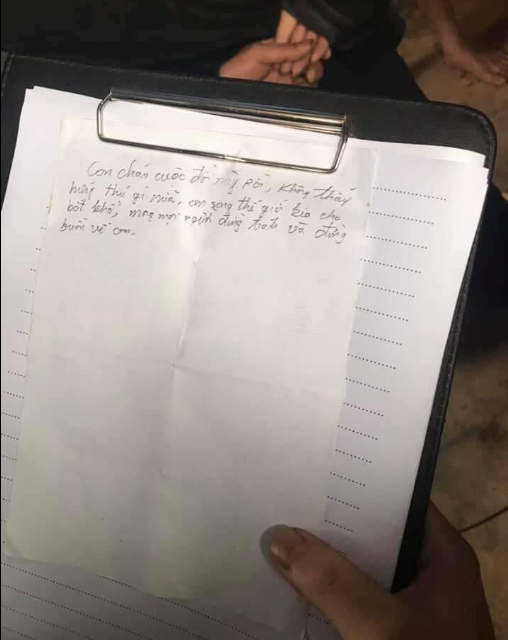 Bên cạnh nạn nhân là 1 tờ giấy viết tay với nội dung buồn chán cuộc sống, mong muốn được giải thoát: