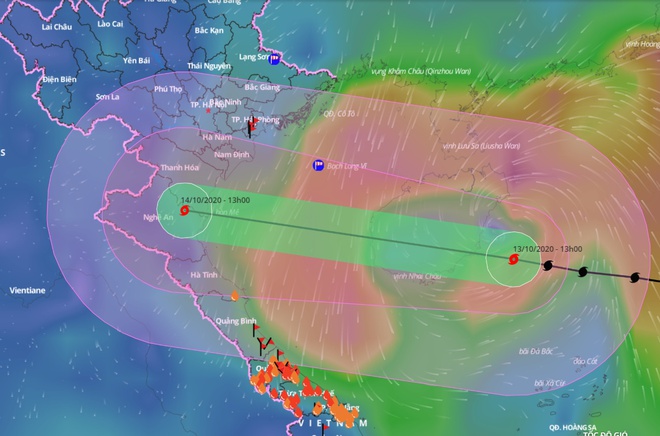 Trong khi đó, hình ảnh đường đi của bão từ Hệ thống giám sát thiên tai Việt Nam cho thấy lúc 13h chiều 14/10, tâm bão đã nằm ngay trên đất liền các tỉnh Thanh Hóa - Nghệ An. Trọng tâm ảnh hưởng của bão nằm ở các tỉnh: Hòa Bình, Hà Nam, Thái Bình, Nam Định, Thanh Hóa, Nghệ An và Hà Tĩnh.