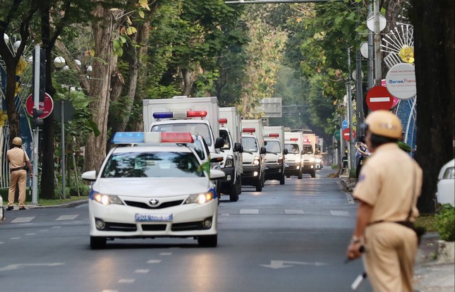 Khoảng 6h50, đoàn xe đầu tiên áp giải các bị cáo đã tới toà án.