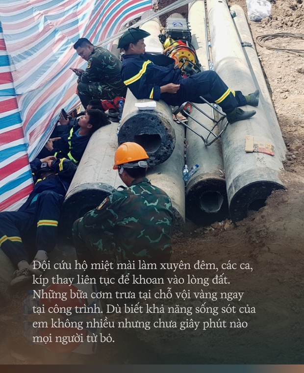 Đội cứu hộ miệt mài làm xuyên đêm, các ca, kíp thay liên tục để khoan vào lòng đất. Những bữa cơm trưa tại chỗ vội vàng ngay tại công trình, những giờ làm việc vất vả nhưng tất cả cùng nhau cố gắng. Oxy liên tục được bơm vào bên trong ống bê tông.