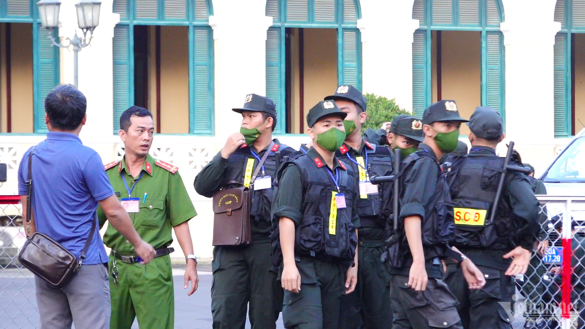 Nhiều lực lượng cảnh sát giám sát khu vực cổng và trước phòng xử án, chỉ những người có giấy triệu tập mới được vào.