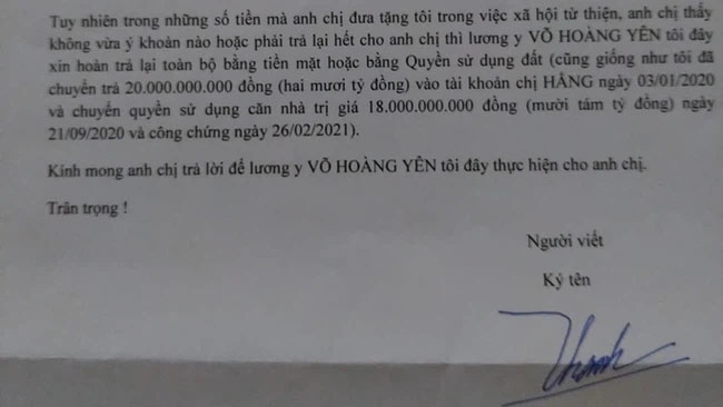 Như trước đó đã thông tin, nội dung thư ông Yên viết: "Trong những số tiền mà anh chị đưa tặng tôi trong việc xã hội từ thiện, anh chị thấy không vừa ý khoản nào hoặc trả lại hết thì lương y Võ Hoàng Yên sẽ hoàn trả lại bằng tiền mặt và tài sản đất".