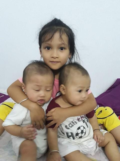 Chị gái Ánh Nguyệt vui đùa cùng hai em song sinh.
