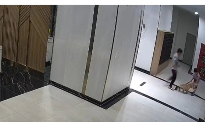 Theo đoạn clip trích xuất từ camera an ninh, tối 2/2, anh Dũng cùng con trai đứng chờ thang máy tại chung cư Q7 riverside. Lúc này, con chó của anh Đ.T.V. (28 tuổi) không rọ mõm, đi từ thang máy ra và tiến lại gần con trai anh Dũng.