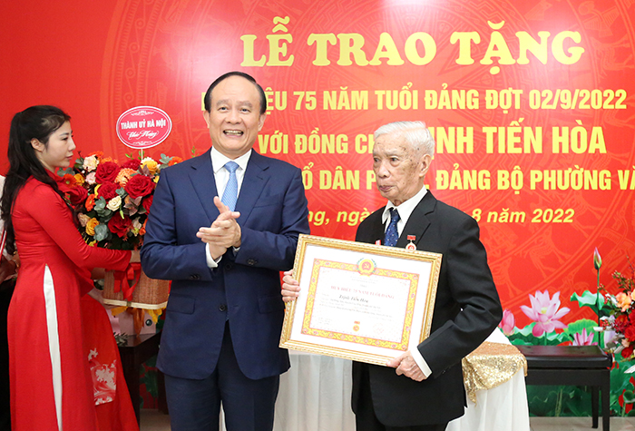 Chủ tịch HĐND Thành phố Nguyễn Ngọc Tuấn trao Huy hiệu 75 năm tuổi Đảng cho đảng viên Trịnh Tiến Hoà