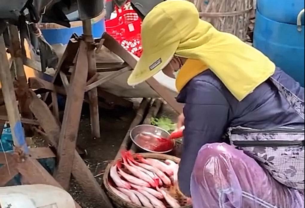 "Thường mùa lạnh con cá bị nhợt màu, mấy chị mua nước sting dâu hoặc dùng bột màu làm mứt hòa ra, bôi lên có màu đỏ cho nó tươi cá chứ không dùng chất gì độc hết" – bà Nga giải thích.