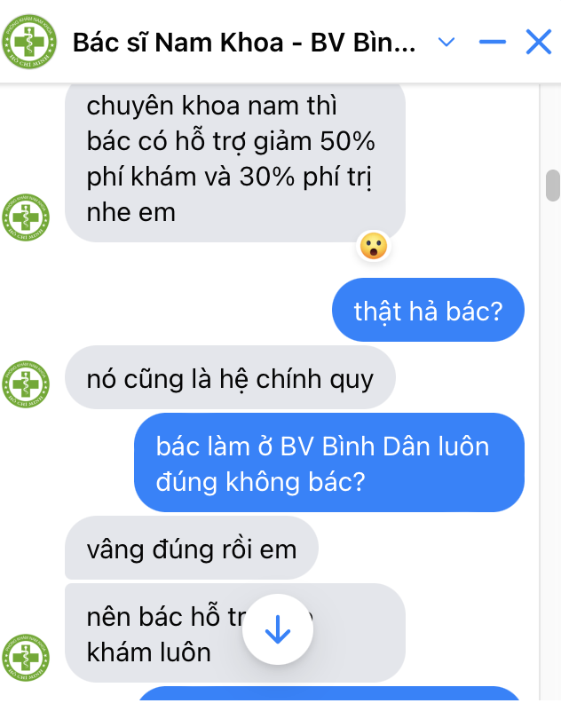 Người sử dụng tài khoản Bác sĩ Nam Khoa – BV Bình Dân cho biết tên là Trang, bác sĩ công tác tại Bệnh viện Bình Dân. “Bác sĩ Trang” khuyên anh Nam đến phòng khám riêng để đảm bảo riêng tư, không khám chung nhiều người như tại bệnh viện.