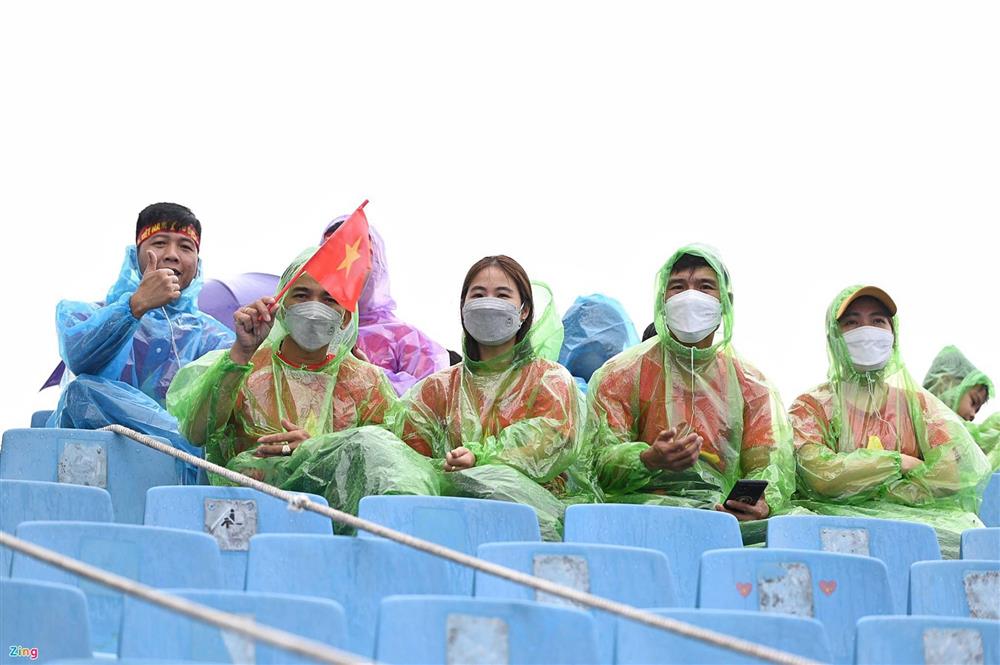 Khán đài C-D không có mái che nên cổ động viên phải mặc áo mưa, che ô ngồi cổ vũ.