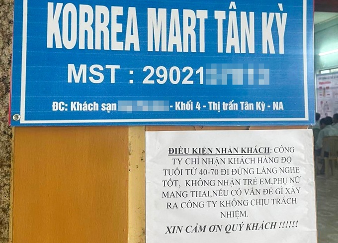 Khoảng 2/2023, Công ty TNHH MTV Korea Mart Tân Kỳ thuê hội trường của một khách sạn ở thị trấn Tân Kỳ, thời gian 4 tháng. Công ty này phát tờ rơi, mời người dân đến tham dự hội thảo giới thiệu sản phẩm. Tại địa điểm tổ chức hội thảo, công ty này dán thông báo "chỉ nhận khách hàng độ tuổi 40-70".